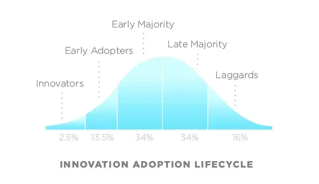 Everett Rogers 提出過技術(shù)采用生命周期理論(Technology Adoption Lifecycle),他指出,勇于嘗試一款名不見經(jīng)傳的新產(chǎn)品的公司,只占整個(gè)市場(chǎng)的 2.5%。