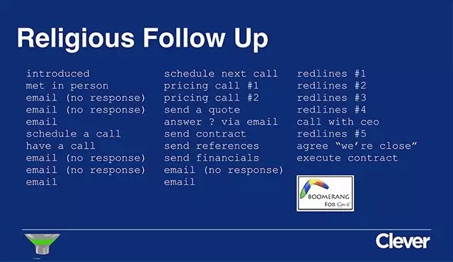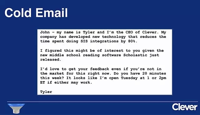 找到這些人有兩個(gè)途徑:一,是通過熟人;二,是通過會(huì)議現(xiàn)場(chǎng)。第一點(diǎn)不用細(xì)說,第二點(diǎn),我所說的會(huì)議不是 CES、E3 這種,而是說如果一群 CIO 要到某個(gè)小城的某家酒店開會(huì),你要先想辦法獲得他們的出席名單、聯(lián)系方式,在會(huì)議開始前就給每個(gè)人發(fā)郵件,再跟進(jìn)到現(xiàn)場(chǎng),抓住每一個(gè)推介自己的機(jī)會(huì)。Clever 早期的銷售工作幾乎就是在重復(fù)做這件事情,我們的初始用戶大部分都是靠這個(gè)方法接觸到。